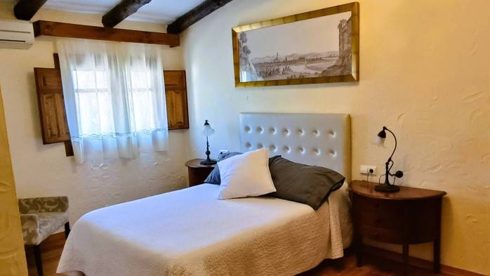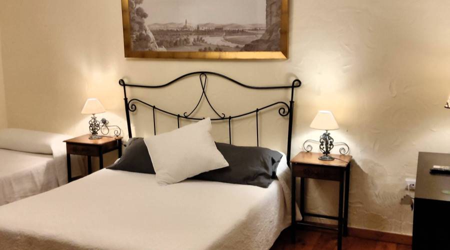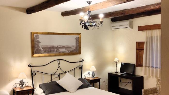 Las habitaciones están equipadas con mobiliario de castaño o forja, suelos de madera o terrazo, techos con vigas de madera, armarios roperos, clima calor-frío, baño completo con plato ducha o bañera, wifi gratuíta, televisores de pantalla plana y bonitas vistas al jardín o al patio.